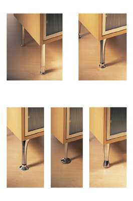 Häfele macht’s möglich: Aus wenigen Teilen entstehen die unterschiedlichsten Möbelfüße. Sie werden mit Gewindeschraube oder mit Anschraubplatte am Möbel befestigt.